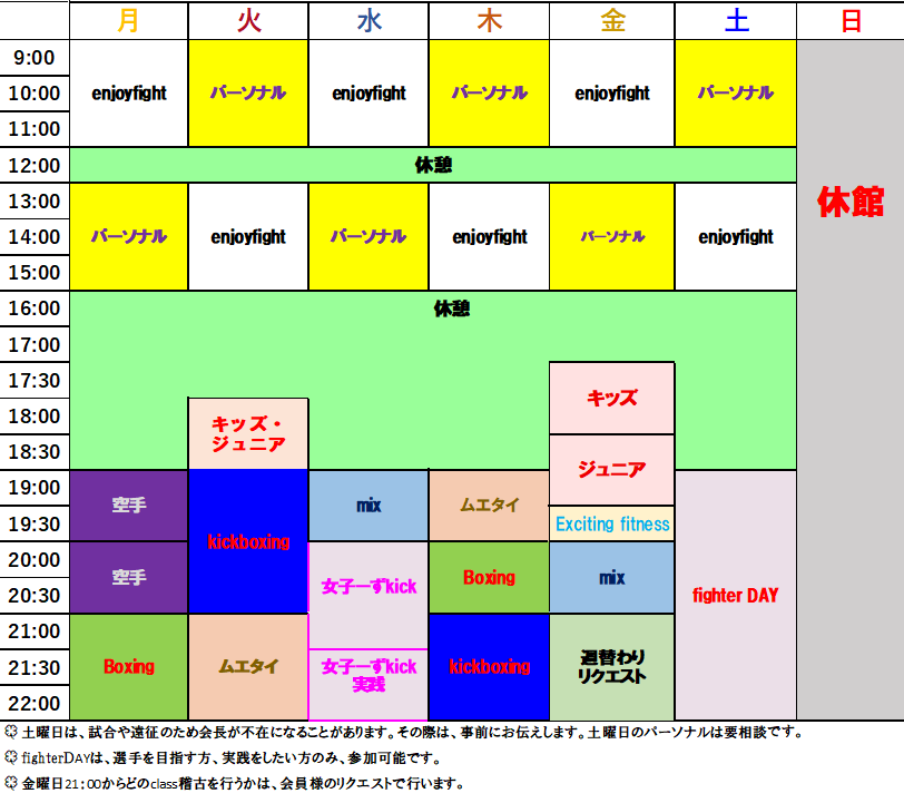 .各classの時間、曜日、はタイムスケジュールをご確認ください。